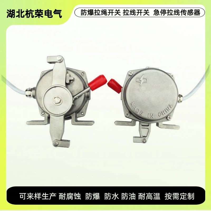 此开关采用回转式凸轮结构,当拉杆手回转时,凸轮随之转动,使微动开关动作,输出开关量,发出报警信号的停机信号。复位方式I型为自动复位,拉杆解除拉力后,凸轮结构自动复位到原始状态。II型为手工复位,凸轮轴回转到一定角度自锁定位,需手工复位手柄后凸轮方能返回原始状态。本装置采用防水、防尘密封设计,较好防止水、灰尘进入机壳内。